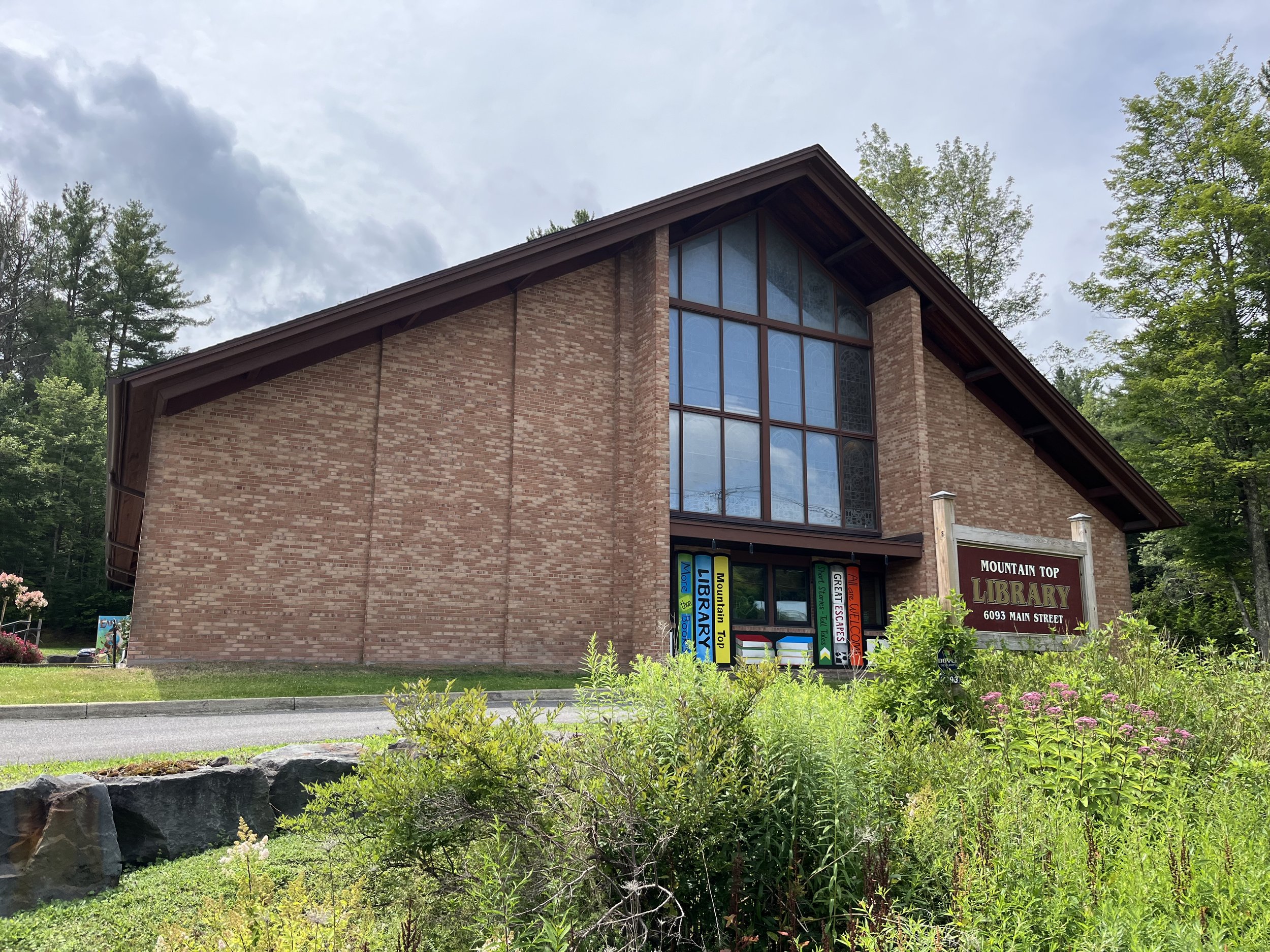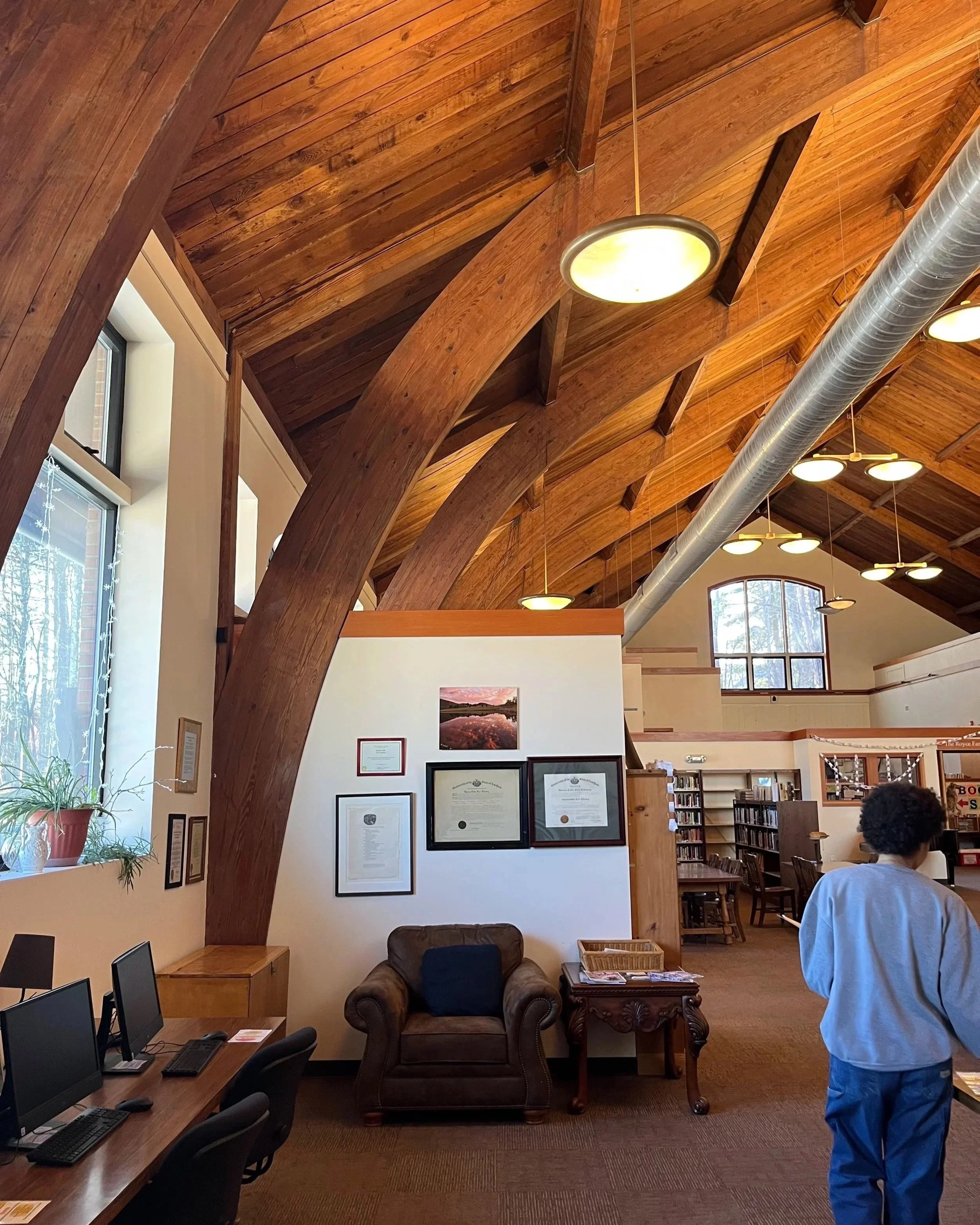 The Mountain Top Library is a distinctly wonderful place. The building is an adapted church with a vaulted ceiling supported by tremendous wooden arches.